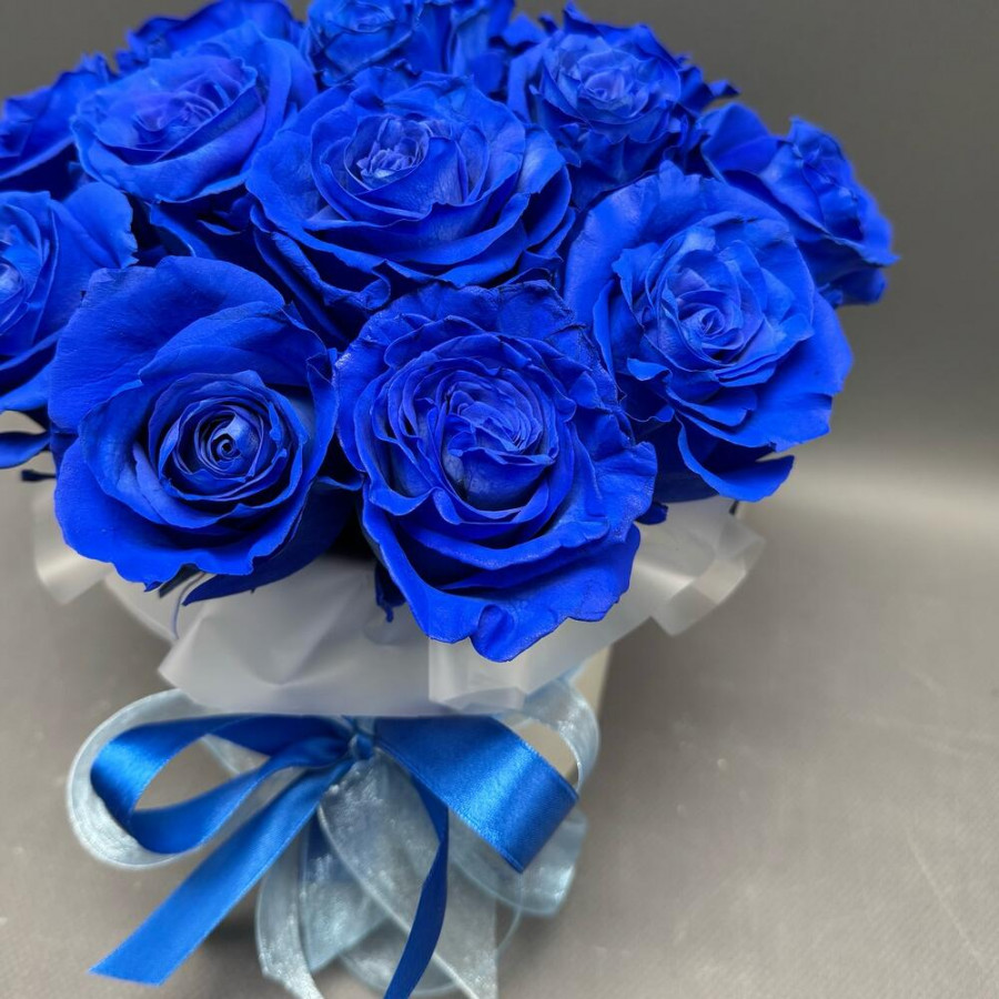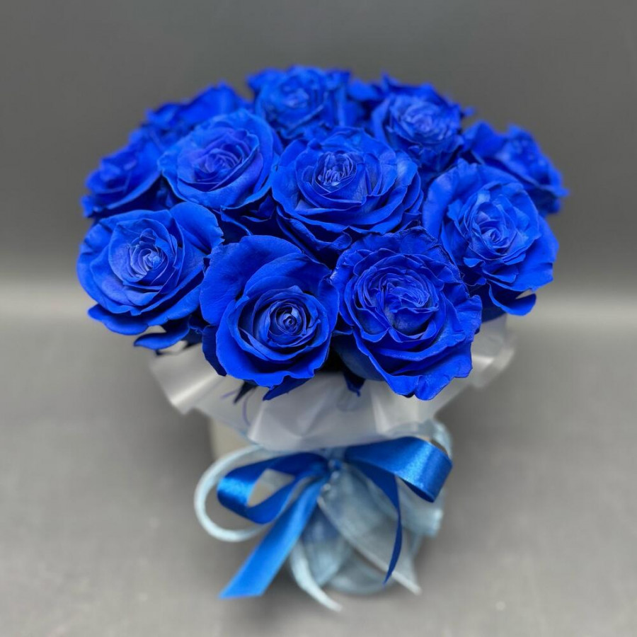 На фото 13 синих роз в шляпной коробке. В составе: роза (синяя) 13 шт, оазис флористический 1 шт, шляпная коробка (s) 1 шт, атласная лента 1 шт, . Все цветы свежие и ароматные, букет красиво оформлен и отлично подходит для подарка. Доступна доставка цветов или самовывоз.
