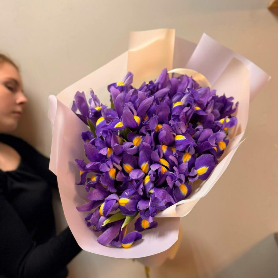 На фото букет из 35 фиолетовых ирисов. В составе: ирис 35 шт, дизайнерская упаковка 2 шт, атласная лента 2 шт, . Все цветы свежие и ароматные, букет красиво оформлен и отлично подходит для подарка. Доступна доставка цветов или самовывоз.